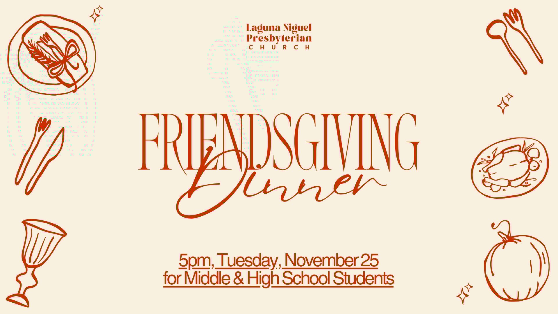 Bring a dish to share! When you register, you’ll be able to sign up for what you’d like to bring so we can build out the full Friendsgiving spread. If you’re not able to bring a dish—no worries at all! But we do love trying all the tasty creations everyone brings. All Middle & High School Students are invited!